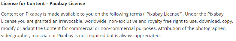 『ライセンスは、商用または非商用の目的でコンテンツを使用、ダウンロード、コピー、加工、取消不能の、世界的、非独占的でロイヤリティフリーの権利を付与されます。 写真家、ビデオグラファー、ミュージシャン、Pixabayの帰属は推奨はしますが、必須ではありません。』