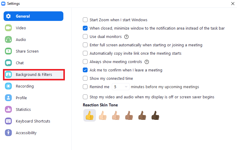 次に設定(Settings)画面の上から6番目にあるバーチャル背景(Background & Filters)を選びます。